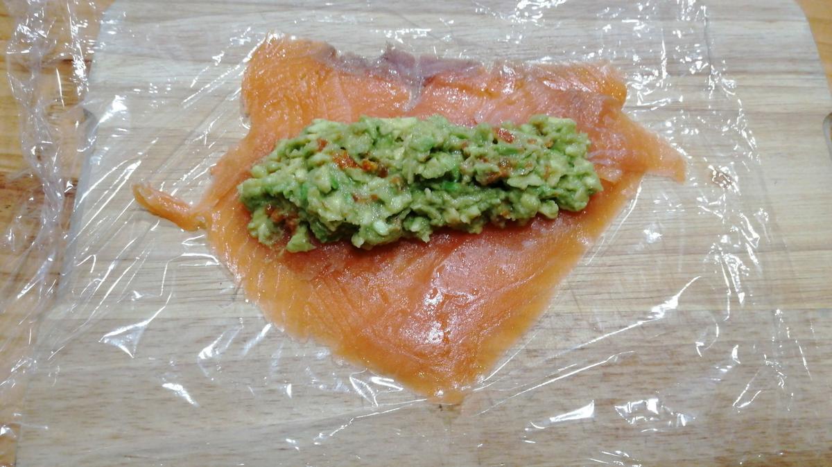 Coloca un trozo de papel film y pon encima un par de lonchas finas de salmón ahumado. Extiende con una cuchara a lo ancho de las lonchas y con un grosor de unos 2-3 centímetros como ves en la foto. Enrolla el salmón para cerrar este canelón ayudándote con el papel film y colócalo en el frigorífico mientras preparamos la mayonesa ají (añádela a tu lista de cremas y salsas, está muy rica).