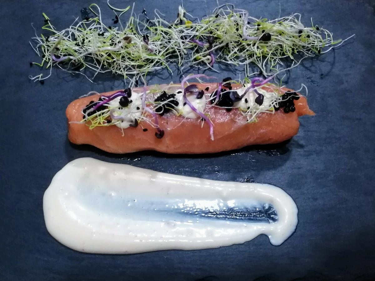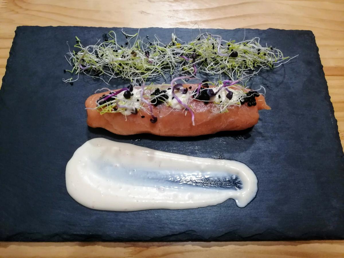 También ponemos unas cuantas huevas del sucedáneo de caviar y completamos la decoración con unos brotes. Ya te digo, yo siempre compro las huevas negras Mujjol Shikran, he probado varias marcas más y no me gustan tanto, el saladito y sabor de estas que me gustan tanto, no lo he encontrado en otras opciones.