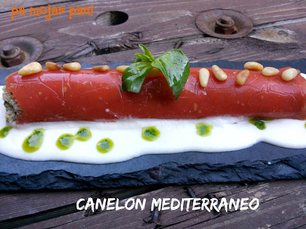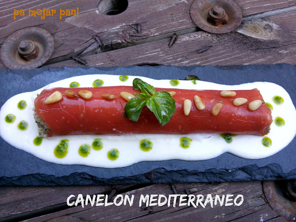 Ya podemos emplatar. Para ello hacemos una cama de nuestra salsa de queso en el fondo del plato y echamos unas gotas del aceite de albahaca. Encima colocamos un canelón. Sobre éste echamos unos piñones tostados y decoramos con una hoja de albahaca.