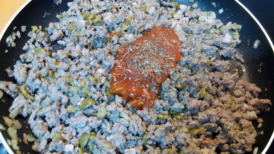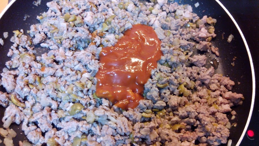 También el jamón y las aceitunas. Procuraremos que esté todo bien picadito. Salpimentamos. Dejamos unos 10 minutos.