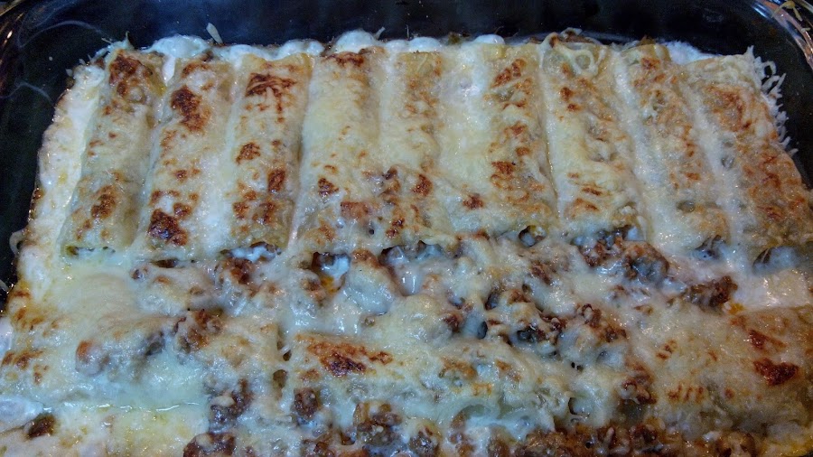 Cuando ya estén blandos, los rellenamos con el sofrito de carne, los enrollamos y los vamos colocando en una fuente apta para horno engrasada con un poco de aceite.