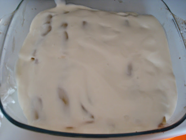 Mientras tanto en la fuente donde vayamos a poner los canelones en el culo echamos un poco de bechamel para que no se peguen y vamos rellenando poco a poco.