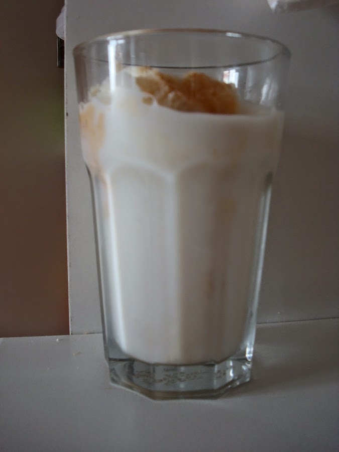 A continuación llenamos un vaso de leche y ponemos la rebanada de pan.