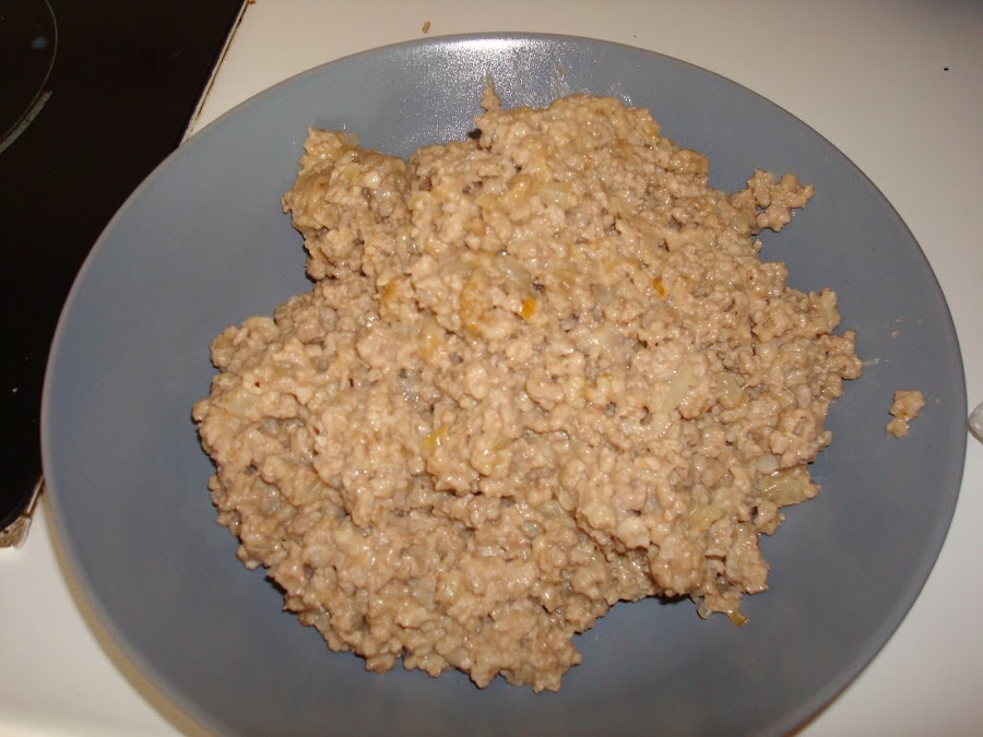 Mientras tanto pornemos en otro sarten la carne picada, con sal, orégano, albahaca, ajo y cebolla en polvo y la vamos dorando.