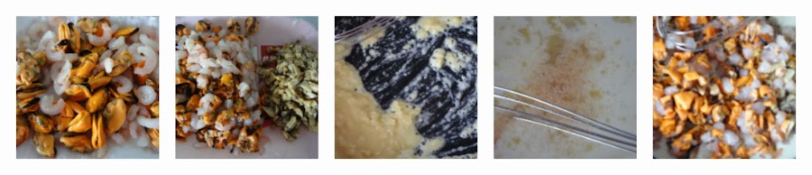 Cuando la mezcla empiece a espesar, añadimos los mejillones, gambas y champiñones picados y, el huevo batido. Removemos rápidamente hasta obtener una bechamel lisa y compacta. Vertemos en una fuente y dejamos atemperar.