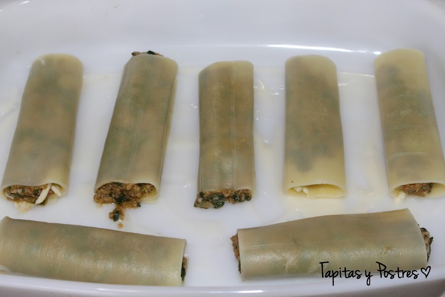 Colocamos los canelones en una fuente con un poco de bechamel.