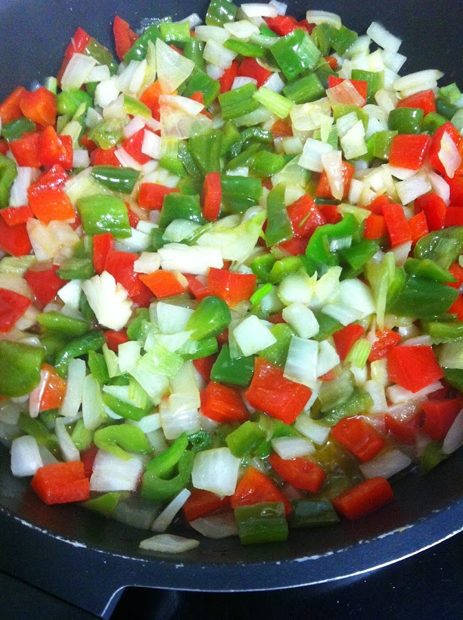 Se pone el aceite en una sartén y se añaden los pimientos troceados y la cebolleta picada. Se rehogan unos 8-10 minutos.