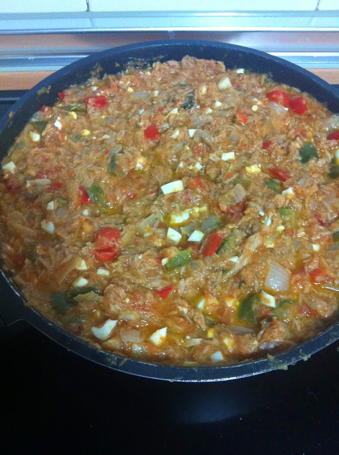 Se añade el atún escurrido y desmenuzado y los huevos duros picados, se salpimenta y se continúa la cocción 3 minutos.