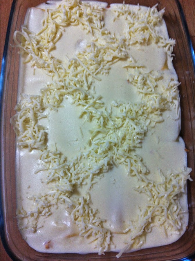 Se vierte la bechamel sobre los canelones, se espolvorean con queso y se gratinan en el horno hasta que se dore el queso.