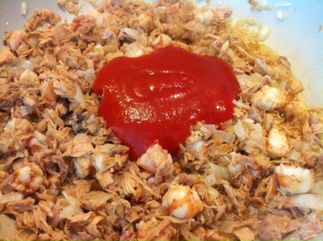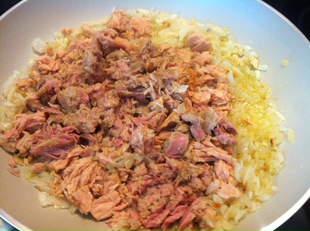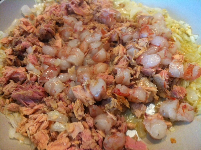 Una vez que estén pochados, echar el atún (previamente escurrido el aceite de la lata), cocinar un par de minutos y añadir los gambones pelados y troceados en trozos de 2-3 cms.
