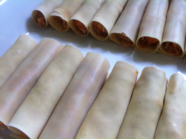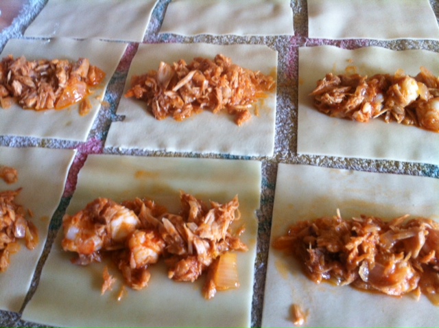 Colocar una porción de relleno en cada placa (como en la foto), enrollar y colocar sobre una fuente de horno.