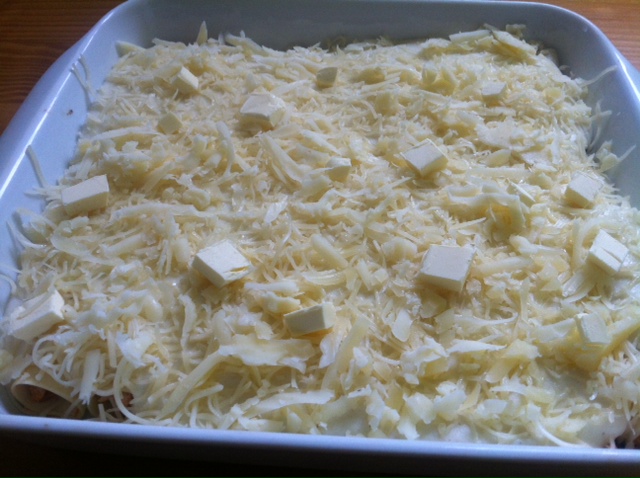 Cubrir la superficie con queso rayado (probar a rayar trozos de diferentes queso) y echar unos pequeños trocitos de mantequilla para que ayude a dorarse en el horno.