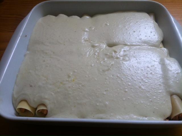 Cuando espese la bechamel, volver a echar leche (ahora 1 vaso) hasta conseguir la textura deseada. Echar un poco de sal y nuez moscada y verter por encima de los canelones.
