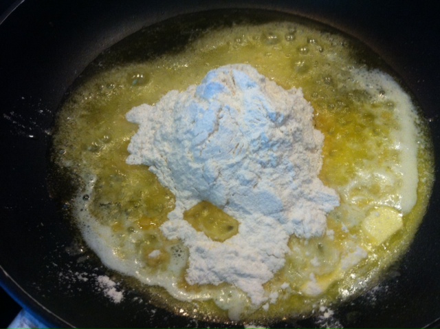 Cuando se funda la mantequilla, añadir las 3 cucharadas de harina y remover sin parar hasta que tome un poco de color la harina y añadir un par de vasos de leche entera y remover sin parar para que no tenga grumos.