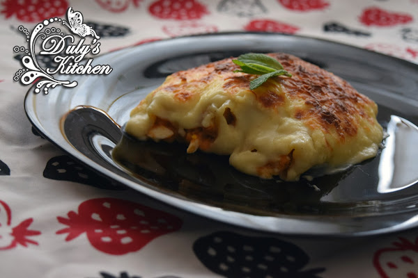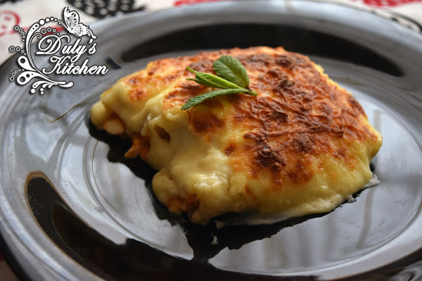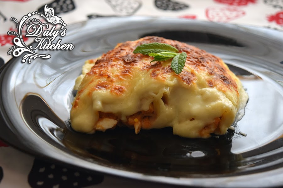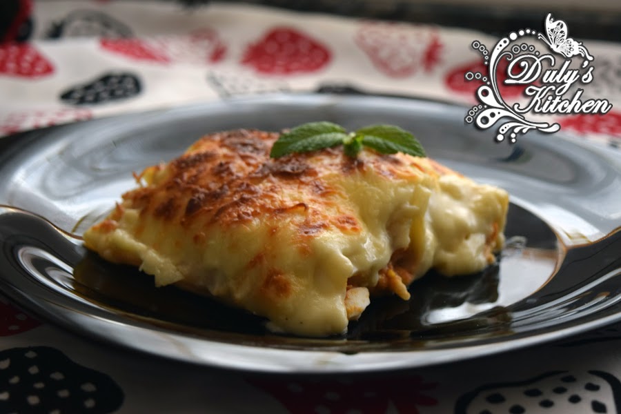 10. Vierte la bechamel sobre los canelones hasta que queden bien cubiertos y espolvorea por encima queso rallado.