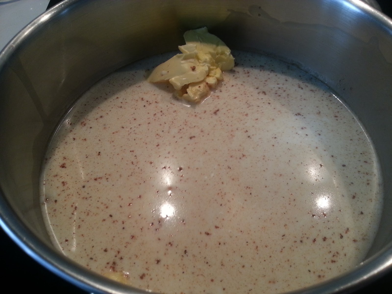 6. - Ponemos en ese momento la leche, menos un poco para diluir la maizena, a calentar junto con la margarina, la nuez moscada y la sal.
