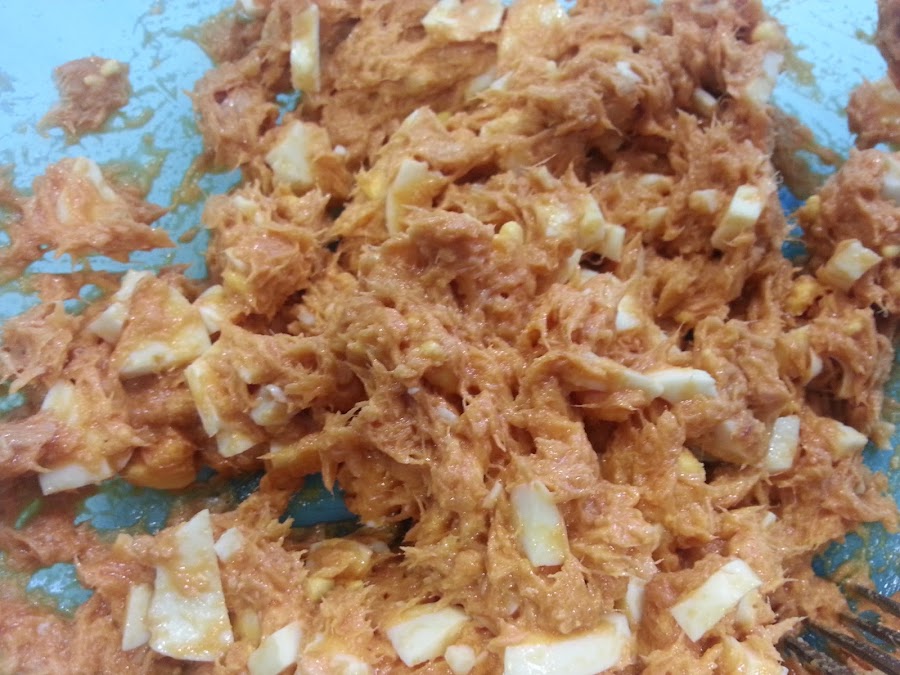 3. - Y Preparamos el relleno, escurrimos el atún, y lo mezclamos con los huevos picados y el tomate, y reservamos.