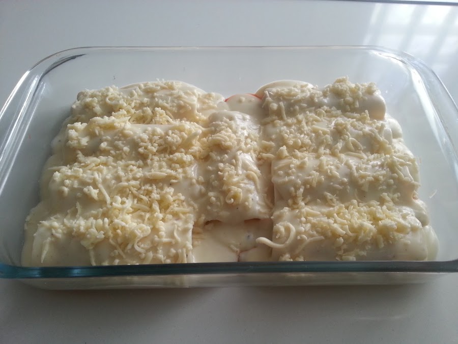 8. - Los ponemos en la fuente con un poco de separación entre ellos. Y vamos a terminar la bechamel....