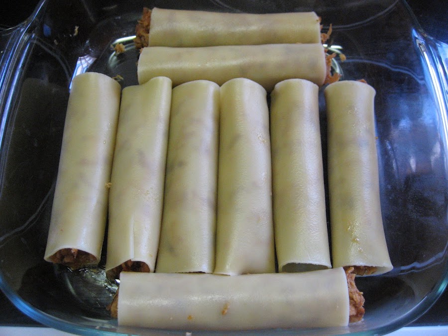 4º " Una vez los vamos rellenando los colocamos en una fuente, para añadirles la bechamel.