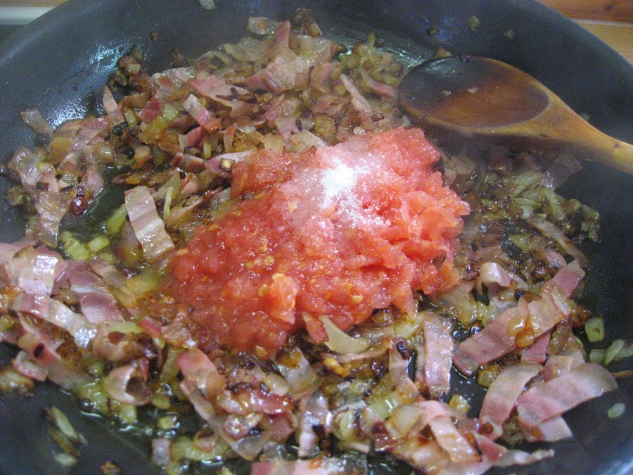 1º " Cortamos la cebolla muy pequeña y la sofreímos. Cuando comience a coger color le añadimos el beicon cortado a tiras, le damos unas vueltas hasta que el beicon quede en el punto que nos guste.
