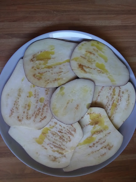 Laminamos la berenjenas en lonchas de medio centímetro más o menos. La disponemos sobre un plato y pincelamos con aceite. Salamos.