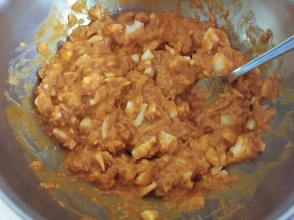 Picamos los huevos, desmenuzamos el atún y añadimos el tomate poco a poco hasta formar un relleno no demasiado acuoso. Salamos.