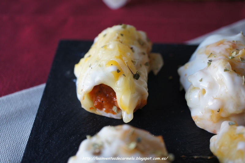 Disponer los bocaditos de canelones en una bandeja para horno. Regar con el bechamel por encima, yo al mio le he puesto un poco de sal, de pimienta blanca y de nuez moscada por encima, espolvorear con el queso rallado.