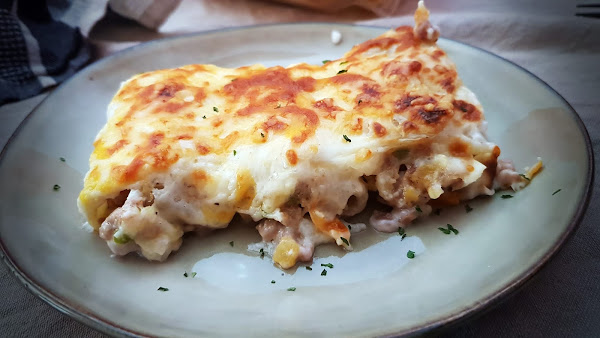 Cubrimos bien con más bechamel y espolvoreamos con queso por encima.
