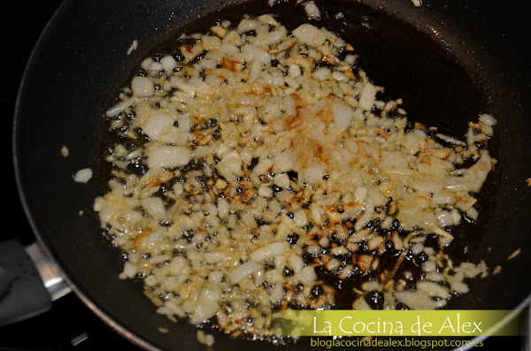 Cuando este bien pochada y dorada, cortamos la calabaza en cuadraditos pequeños y los incorporamos a la cebolleta pochada. Cocinando todo junto hasta que la calabaza este tierna.