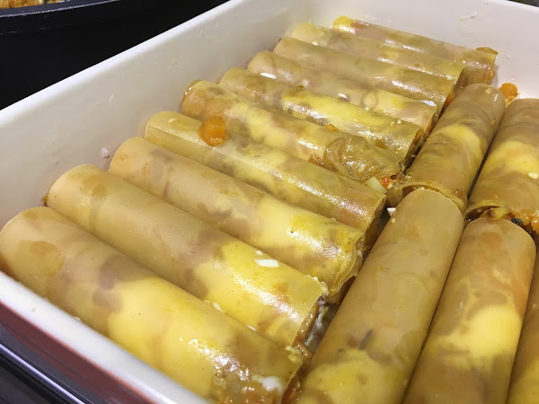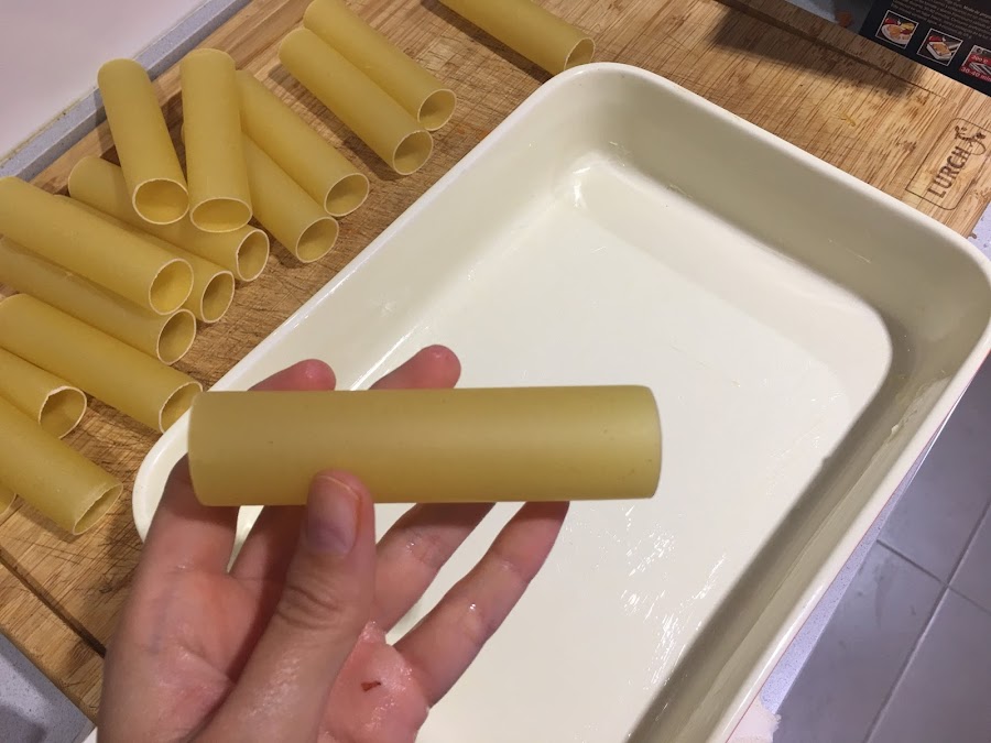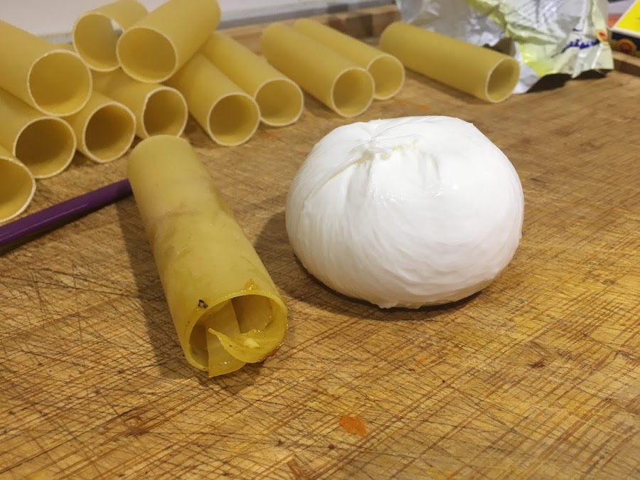 4. Preacalentamos el horno a 200ºC. El tipo de pasta que he utilizado para esta ocasión no requiere cocción. Así que rellenamos los canelones con el sofrito de calabaza y un poquito de burrata fresca en cada canelón.