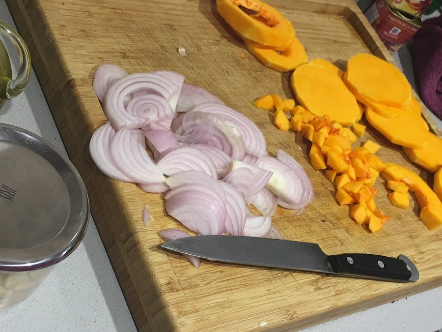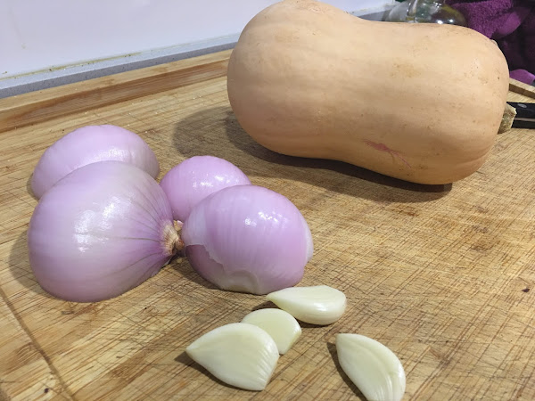 1. Empezamos pelado la calabaza, la cebolla y los ajos. Los ajos los laminamos finitos, la cebolla también y la calabaza la cortamos a trocitos pequeños.