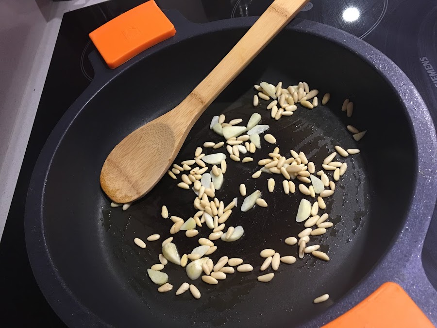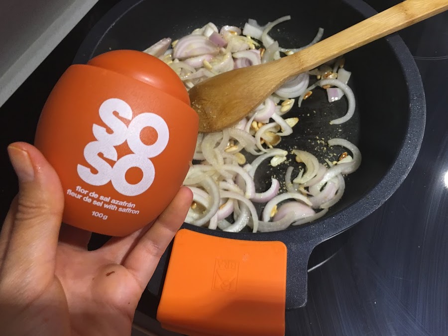 2. En una cazuela sofreímos los ajos y los piñones, cuando los piñones empiecen a tomar color, añadimos la cebolla y salamos con flor de sal de azafrán de soso factory.
