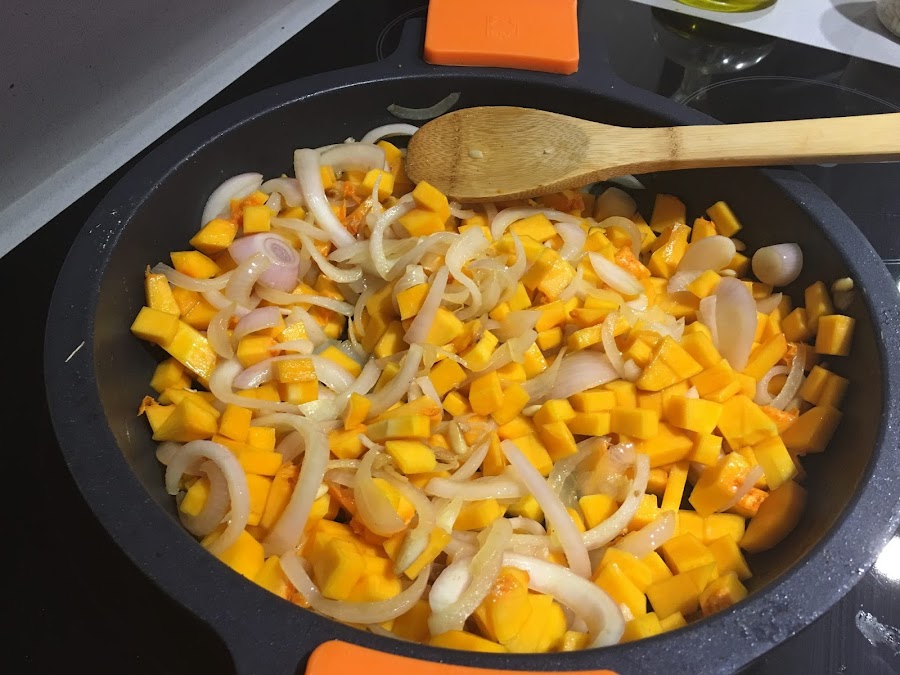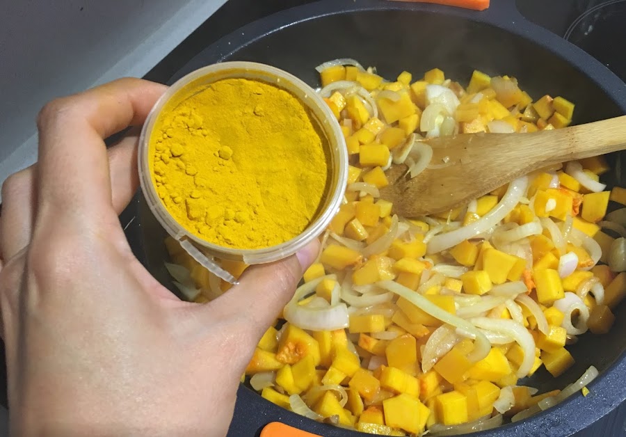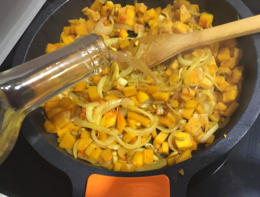 3. A continuación añadimos la calabaza, la rehogamos durante 10 minutos. Añadimos la cucharadita de cúrcuma, el vino blanco y seguimos sofriendo durante 10 minutos más a fuego medio.