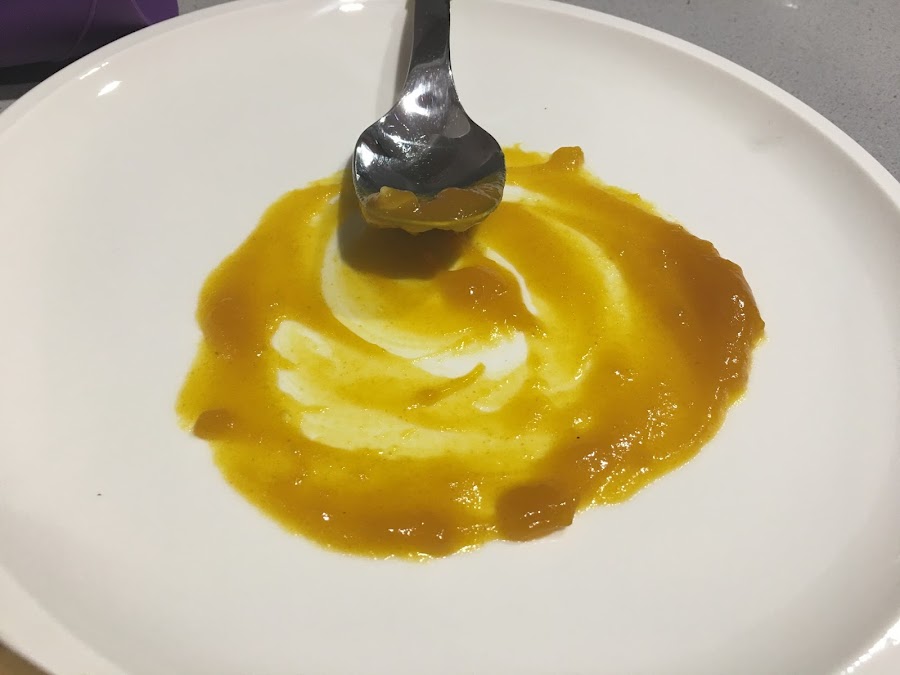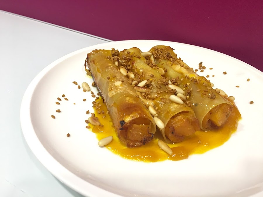 5. En la base del plato ponemos un par de cucharadas de mantequilla de calabaza con jengibre, es una especie de mermelada pero algo más densa, este producto venía en la degustabox del mes de septiembre. Sobre ella colocamos los canelones y sobre éstos unos piñones tostados junto con unas semillas de sésamo caramelizado con cúrcuma de ecoriginal, deliciosas.