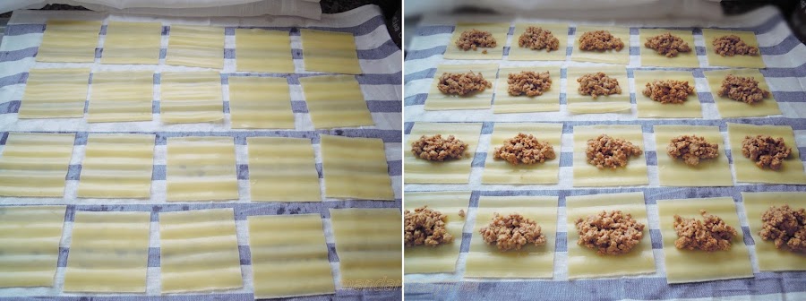 Pon una cucharada de carne en cada placa de pasta, llena lo suficiente para que se pueda cerrar el canelón.