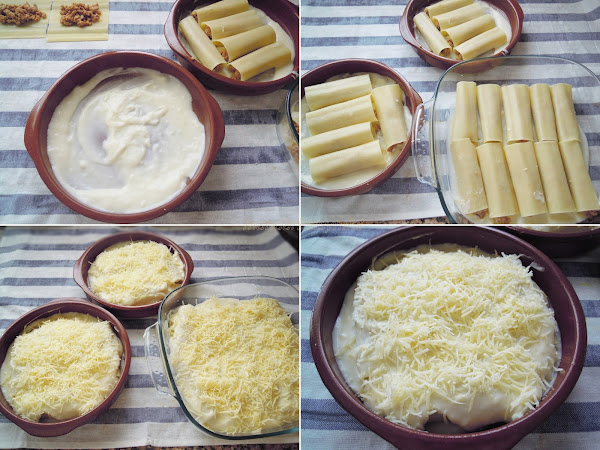Reparte el resto de la bechamel por encima de los canelones, y cúbrelos con el queso rallado.