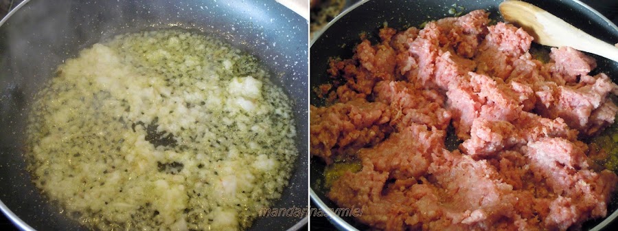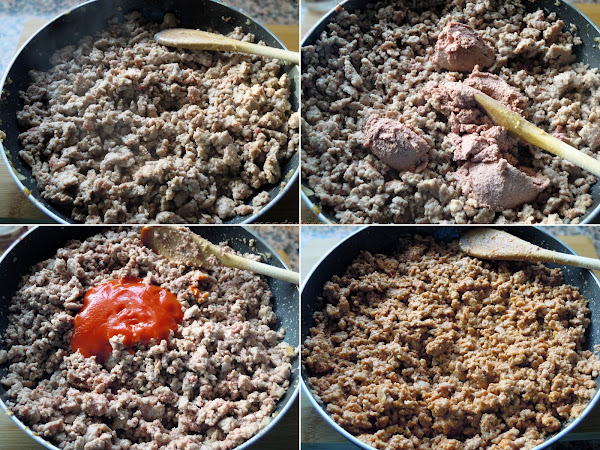 Cuando haya cambiado de color, añade la carne picada y el jamón, deja que se dore y sazona con sal y pimienta.