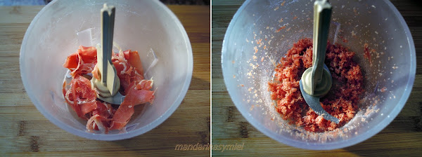Pica o tritura el jamón y añádelo a la carne picada, también puedes pedir en la carnicería que te lo piquen con la carne, yo suelo hacerlo.