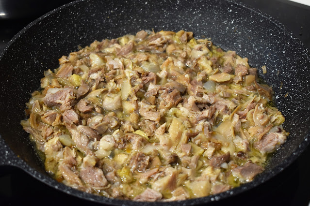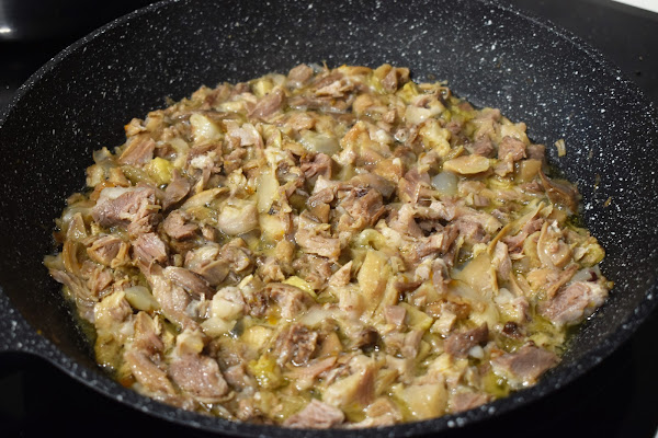 Añade las setas a la carne remueve y añade el mousse de pato.