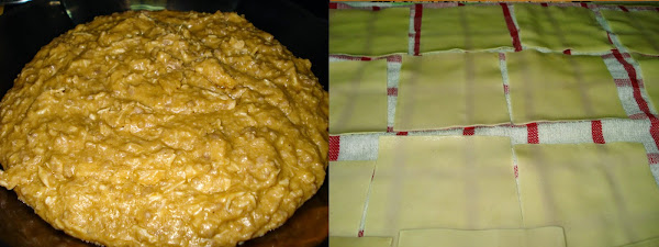 Mientras se enfría el relleno ponemos las placas en remojo siguiendo las instrucciones del paquete, las sacamos después del tiempo recomendado y las escurrimos y las colocamos sobre un trapo limpio para quitar el exceso de agua.