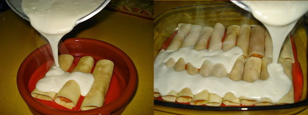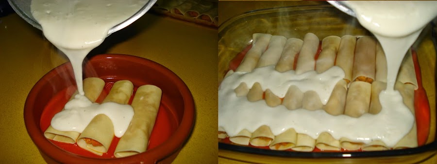 Cubrimos los canelones con la salsa bechamel, espolvoreamos por encima el queso rallado y metemos al horno a 180º aproximadamente media hora y si hace falta al final gratinamos un poco sacamos y ¡¡YA ESTÁN LISTOS PARA COMER!!