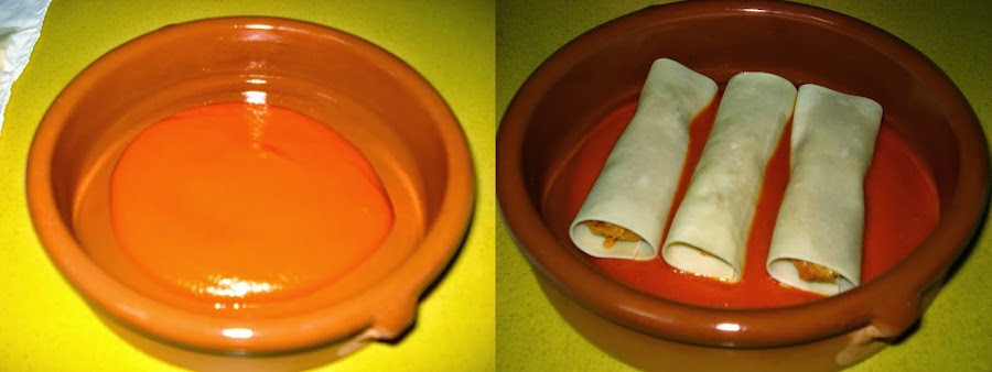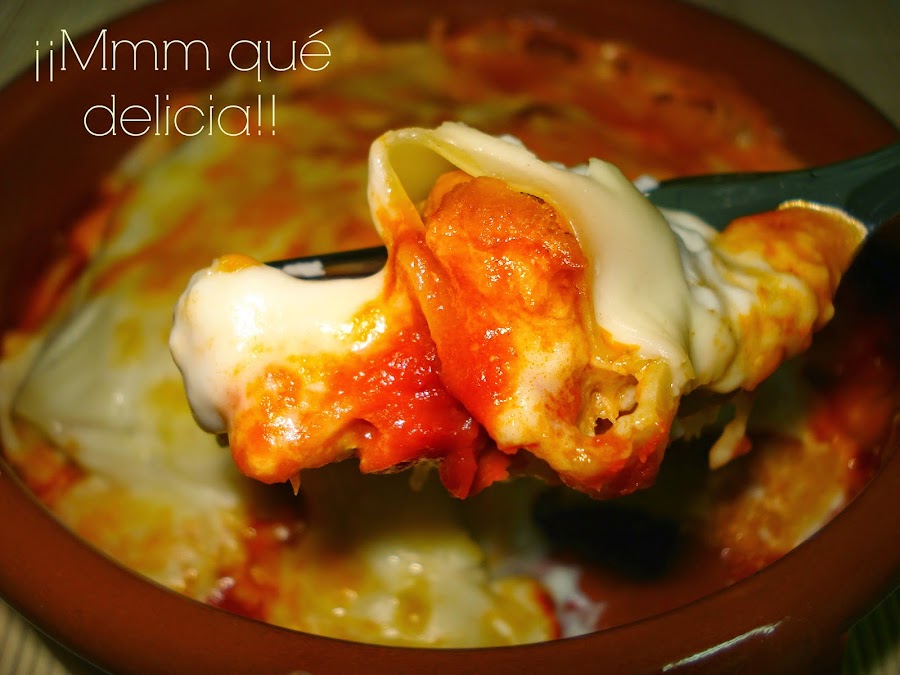 Rellenamos las placas con la masa fría o tibia y las vamos colocando sobre una fuente de horno en la cual hemos puesto tomate frito en su fondo. También podemos prepararlas de forma individual en cazuelas de barro colocando tomate frito en el fondo y encima unos 5 canelones.