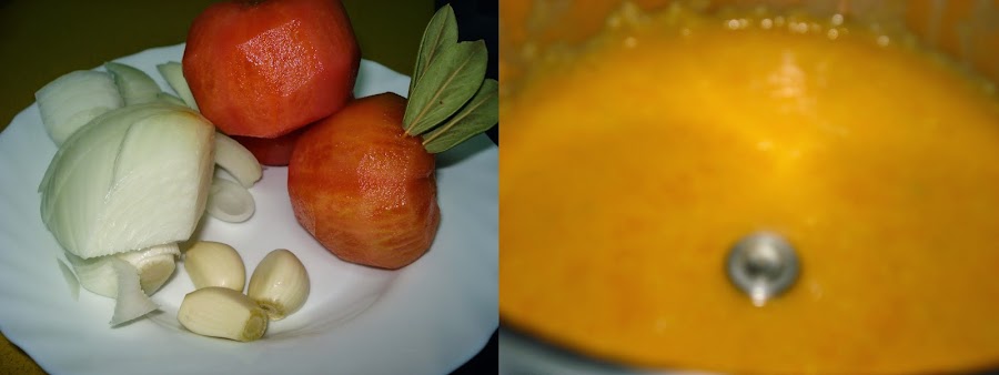 Echamos en el vaso de la batidora el ajo, la cebolla y los tomates pelados y lo batimos todo muy bien.