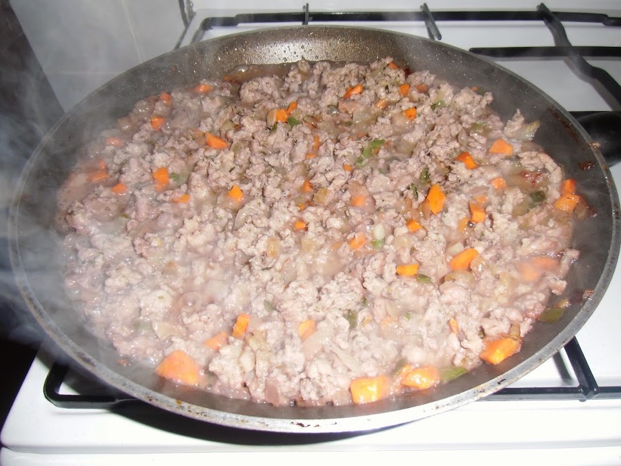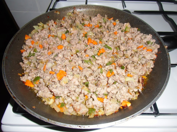 Cuando estén blanditas incorporamos la carne previamente mezclada con sal y las hierbas provenzales.
