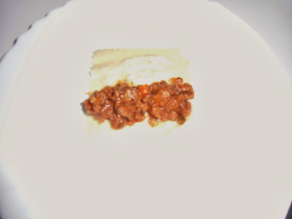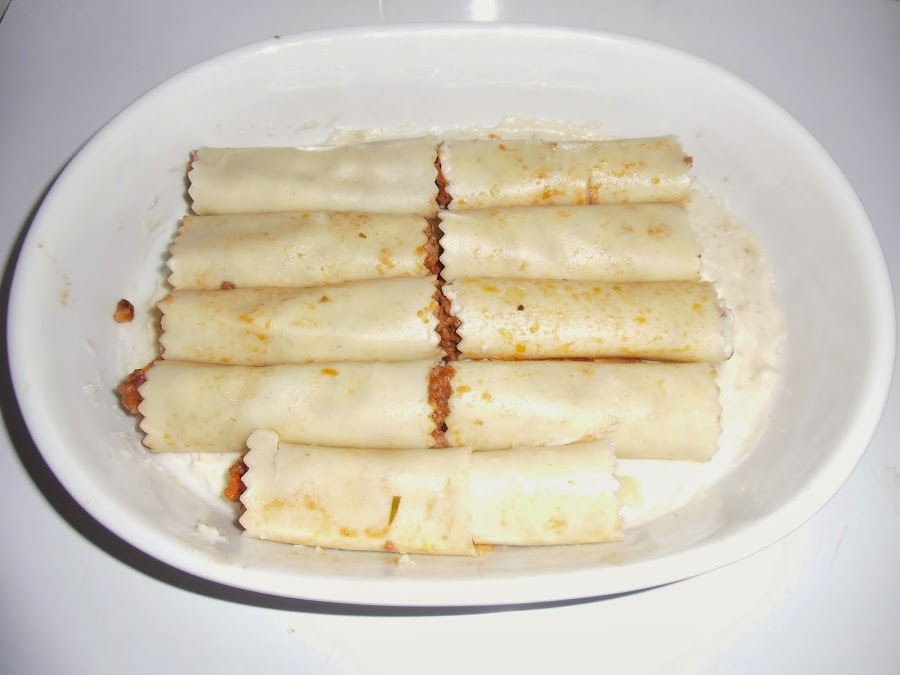 Ponemos en cada lamina un poquito de bechamel, una cucharada de carne, los enrollamos y los vamos colocando sobre la bandeja