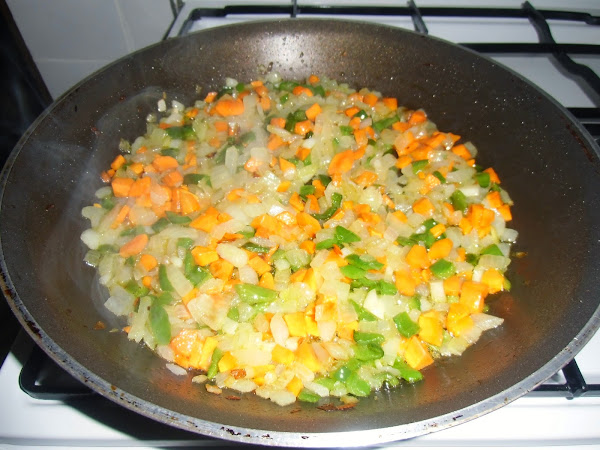 A continuación añadimos los pimientos y a los dos o tres minutos las zanahorias y un poco de pimienta negra molida.