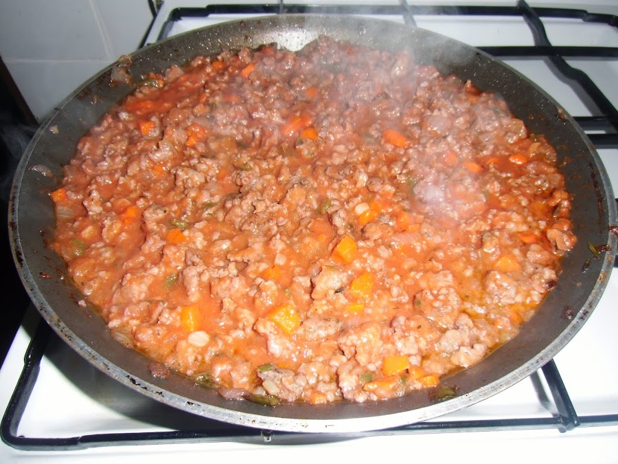 Dejamos reducir, añadimos el tomate y cocinamos a fuego medio-lento unos 25 o 30 minutos