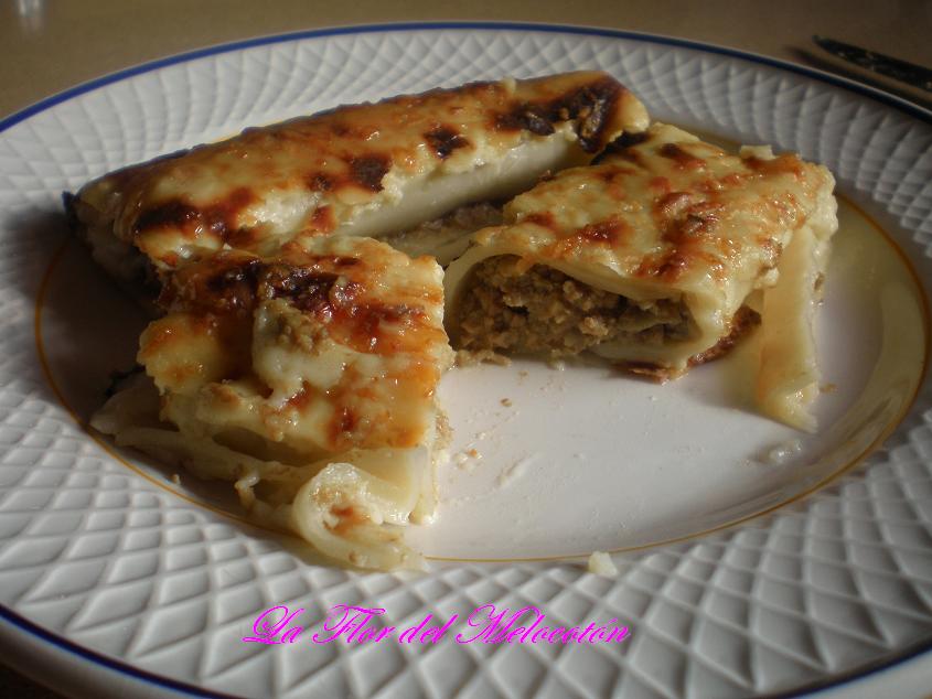 Pintamos con mantequilla la bandeja de horno y vamos poniendo los canelones ya cerrados. Les echamos la bechamel por encima y los gratinamos.