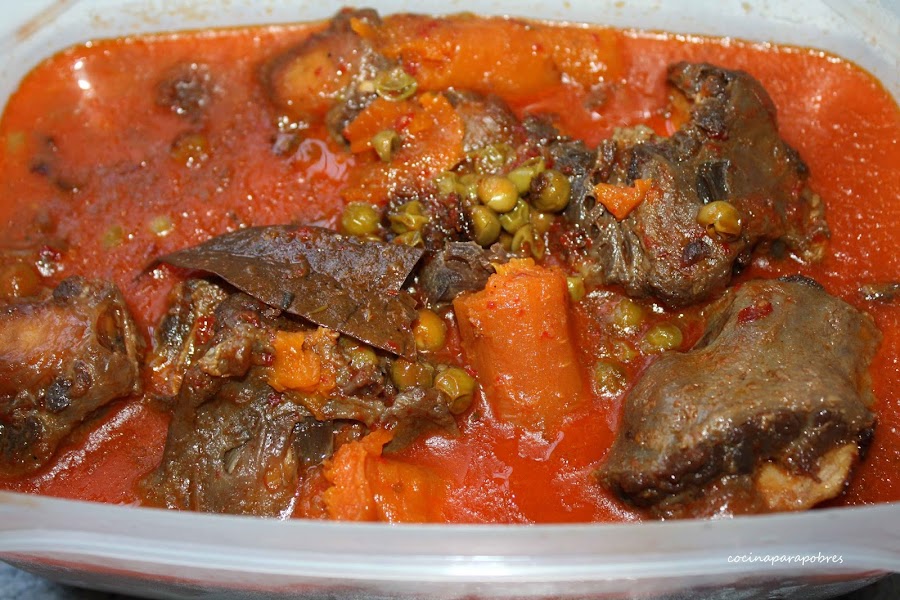 Incorporamos el rabo, el vino tinto, agua, especial y un poco de sal a gusto. Dejamos cocer a fuego suave durante dos horas y media, pasado este tiempo añadimos una zanahoria pelada y los guisantes, dejamos cocer 20 minutos más.