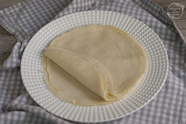 PREPARACIÓN:Lo primero que prepararemos serán la masa para los crepes, tamizamos la harina, añadimos los huevos ligeramente batidos y mezclamos, y vamos añadiendo poco a poco la leche removiendo con unas varillas para que no queden grumos. Añadimos la sal. Tapamos y dejamos reposar al menos una hora en el frigorífico.
